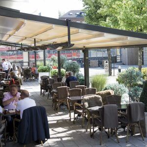 av uteplassen. Dette er et tak som kan lukkes på få sekunder. Det er plastbelagt og laget av vann- og vindbestandig materiale for total beskyttelse uavhengig av værforholdene.