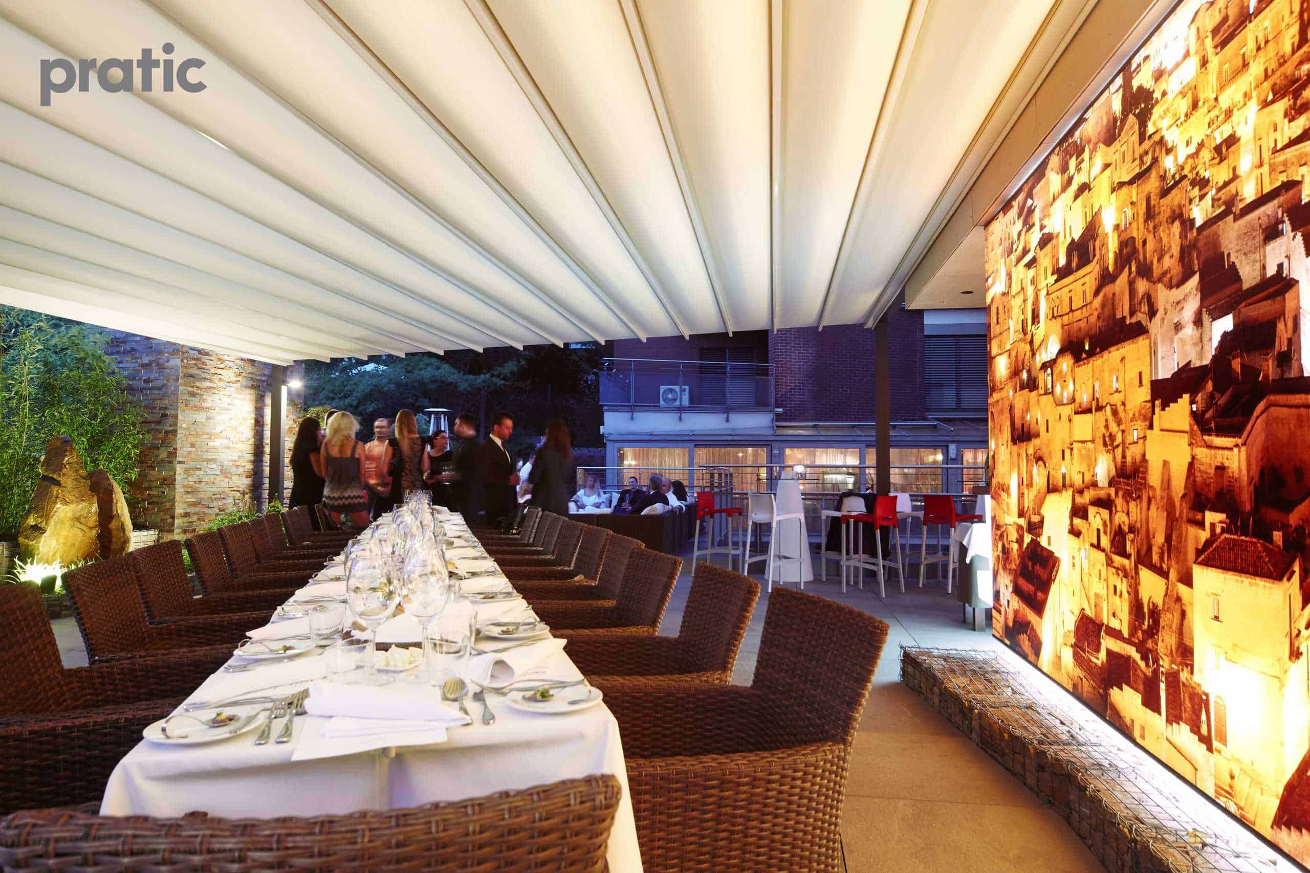 Tecnic Evo er produsert i aluminium. Den beskytter mot sol, vind og regn og skaper et behagelig utendørsrom ved alle årstider.