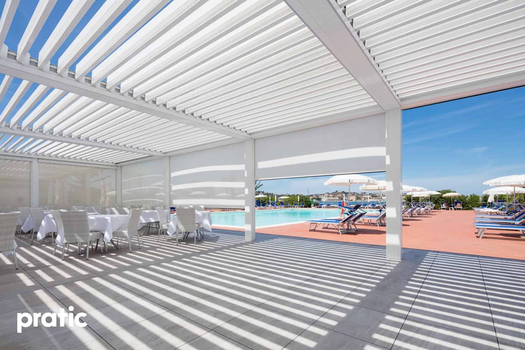 Opera og Vision er pergola med ramme og spiler i aluminium.