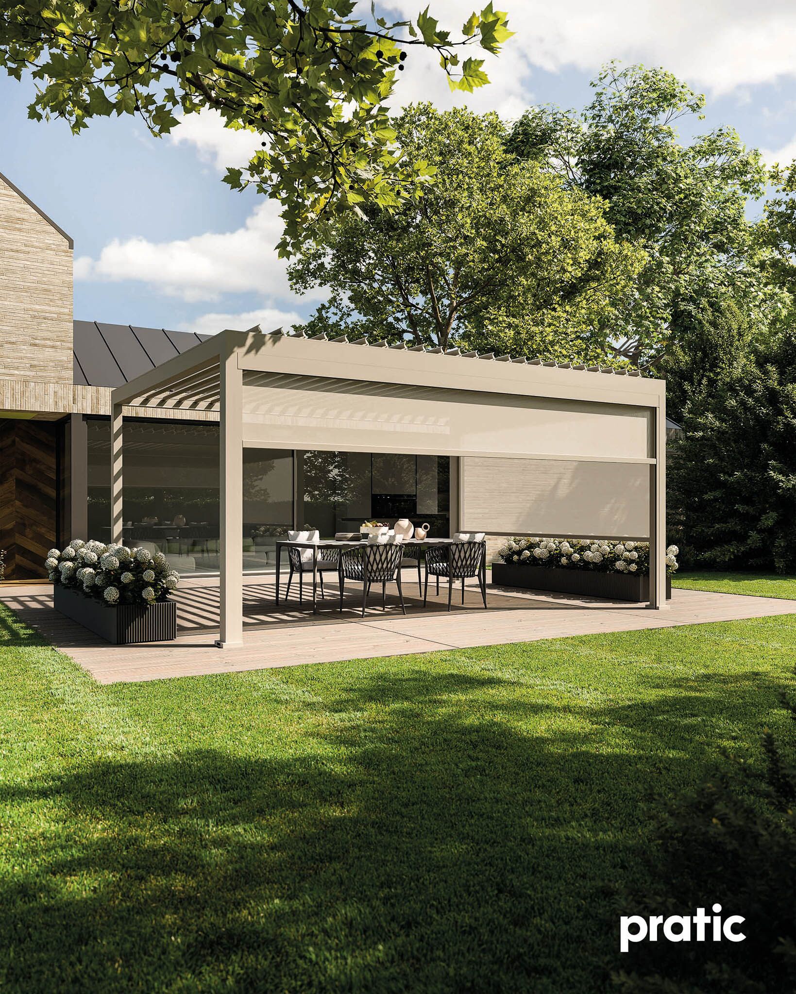 Sense er en moderne og stilren bioklimatisk pergola fra Pratic, utviklet for å gi maksimal fleksibilitet i uteområder. De motoriserte lamellene kan justeres fra 0° til 110°, slik at du enkelt kan styre lys, ventilasjon og skygge gjennom dagen. Dette gjør Sense til et ideelt valg for restauranter, hoteller og private uterom som ønsker å tilby en behagelig og eksklusiv opplevelse.