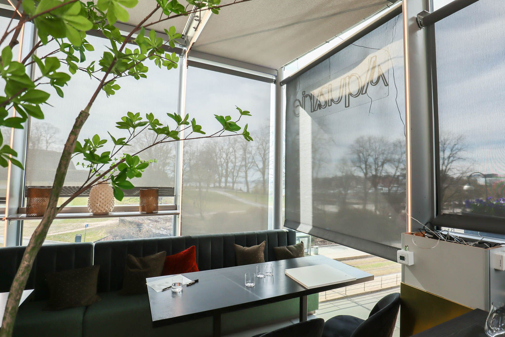 Ideen om å bygge en fiskerestaurant i ett glasshus og kalle det Aquarie er kreativt og noe folk definitivt legger merke til. Det kan derimot også by på problemer med tanke på sola som steker mot vinduene på sommeren. Da Aquarie tok kontakt med oss angående solskjerming, kom vi frem til at den beste løsningen her var å montere motoriserte screens i stålskjelettet til bygget for å dekke alle glassflater. Disse vil skjerme mot sola uten å ødelegge for utsikten til Akershus festning. Det slippes også inn nok sollys fra sidene slik at bygget ikke blir alt for mørkt når de er kjørt ned. I tillegg til å være funksjonelle er screens også svært stilfulle og de passet godt sammen med både interiøret og bygget til Aquarie.