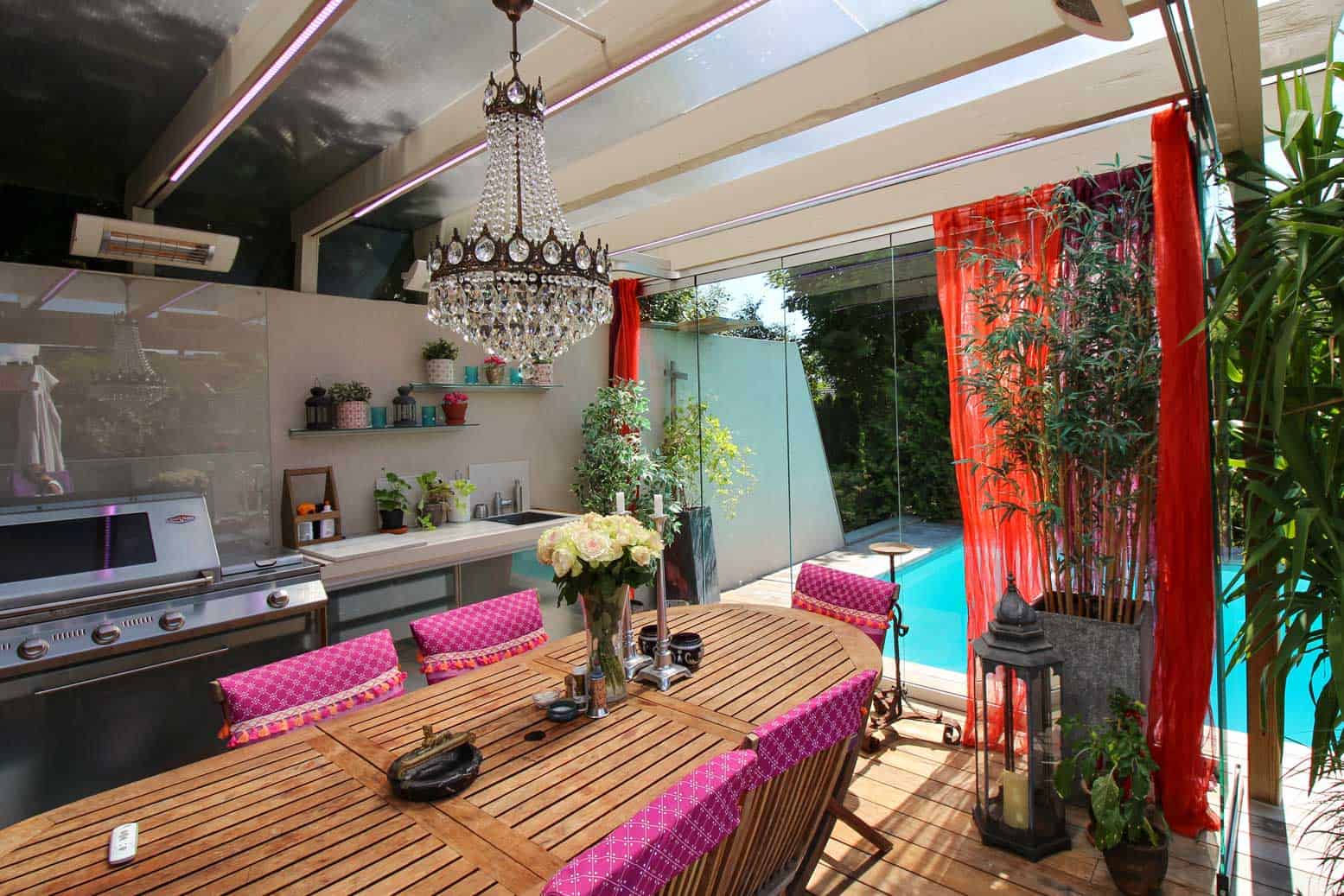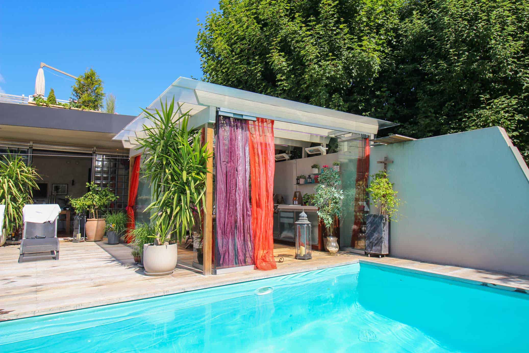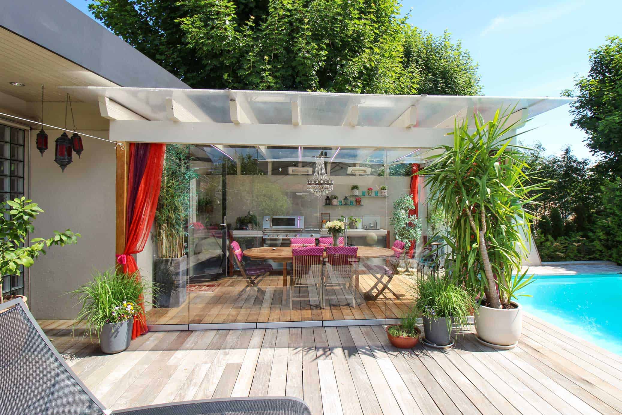 Solskjermingsgruppen har levert parasoller, hev og senk glass, varmelamper og skyveglass til innglassing av pergola til en privat bolig i Oslo.