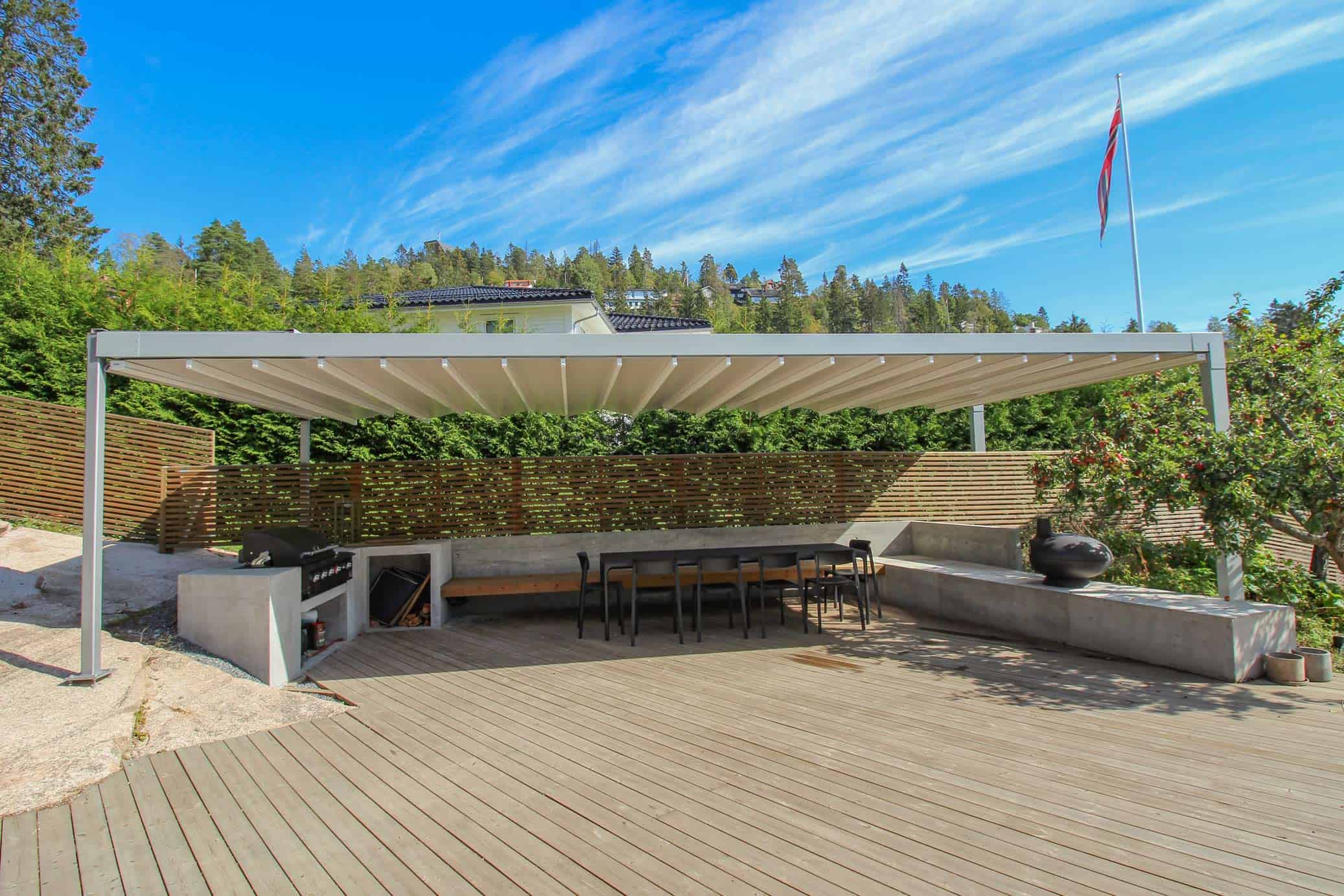 Den store og fine uteplassen til kunden har nå fått en ny bruksplass med grill og stor spiseplass. Alle våre pergolaer bestilles etter nøyaktige mål og tilpasses til hvert prosjekt. På den måten kan vi måle opp nøyaktige mål på millimeteren, slik at vi får dekket mest mulig av uteplassen. På denne leveringen kan vi se at konstruksjonen på pergolaen er målt opp nøyaktig, slik at kunden får utnyttet området pergolaen står på. Sluttresultatet her ble en pergola på over åtte meter i lengden, så her har kunden masse plass til å innrede pergolaen slik de selv ønsker.