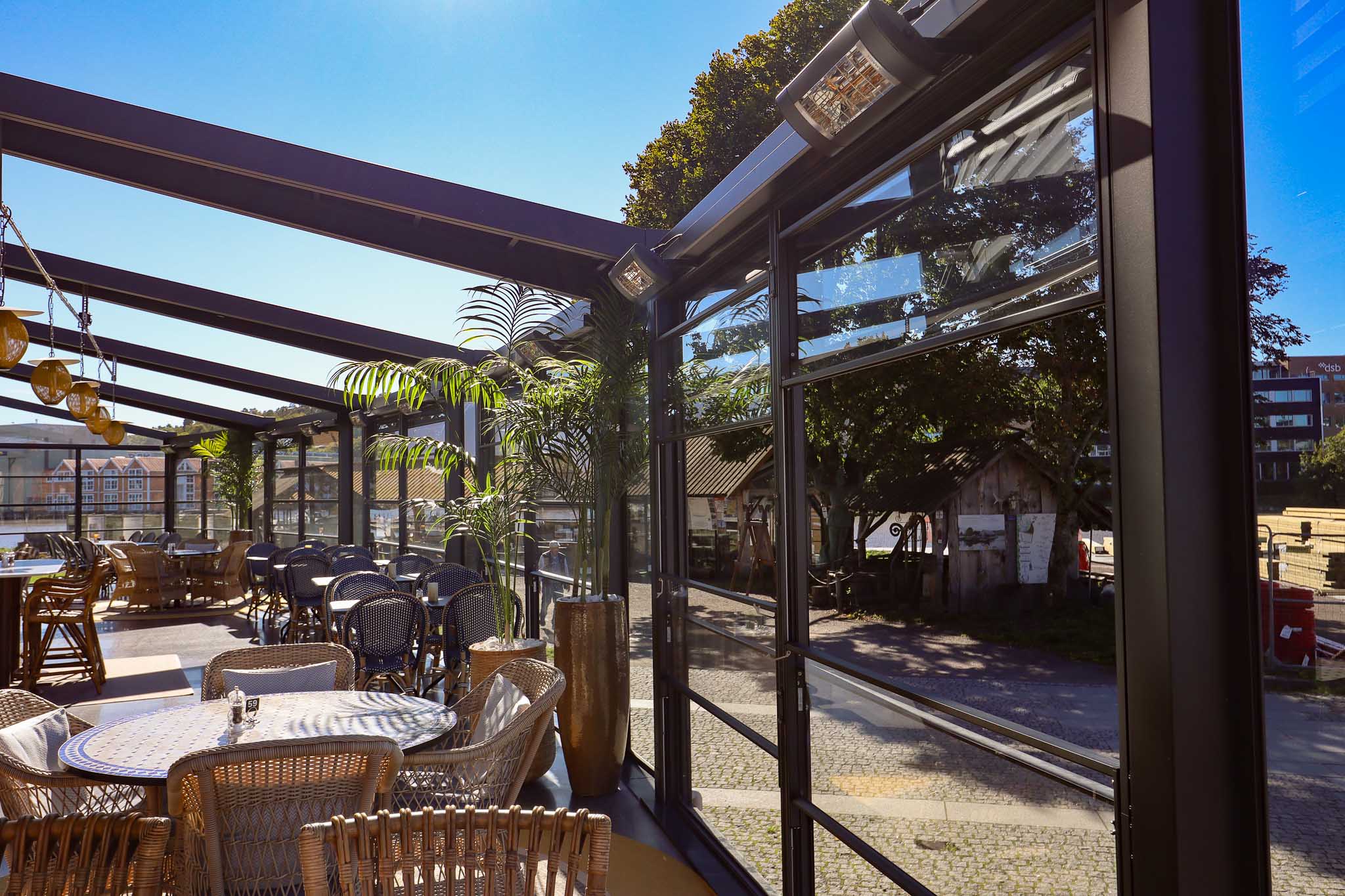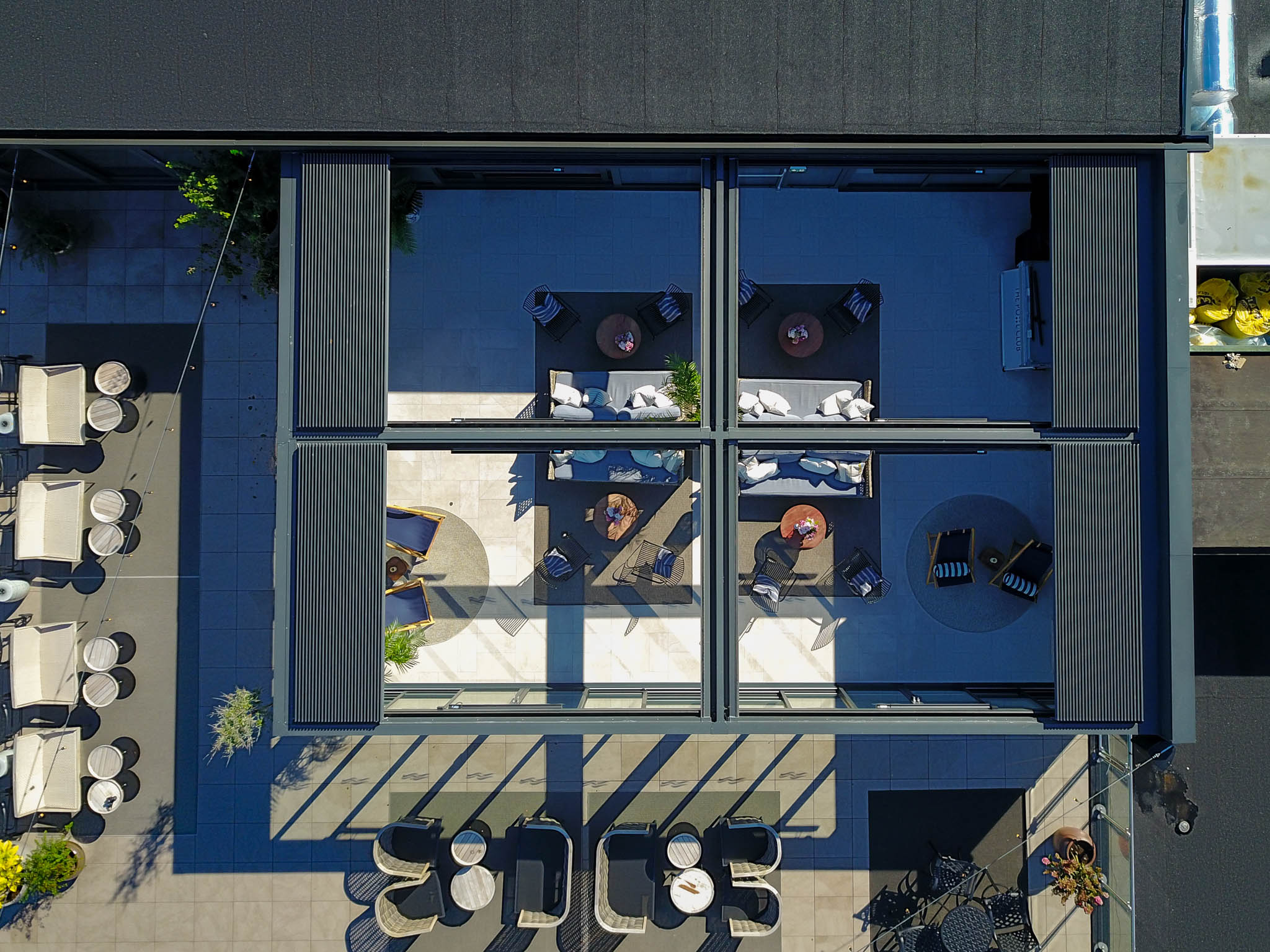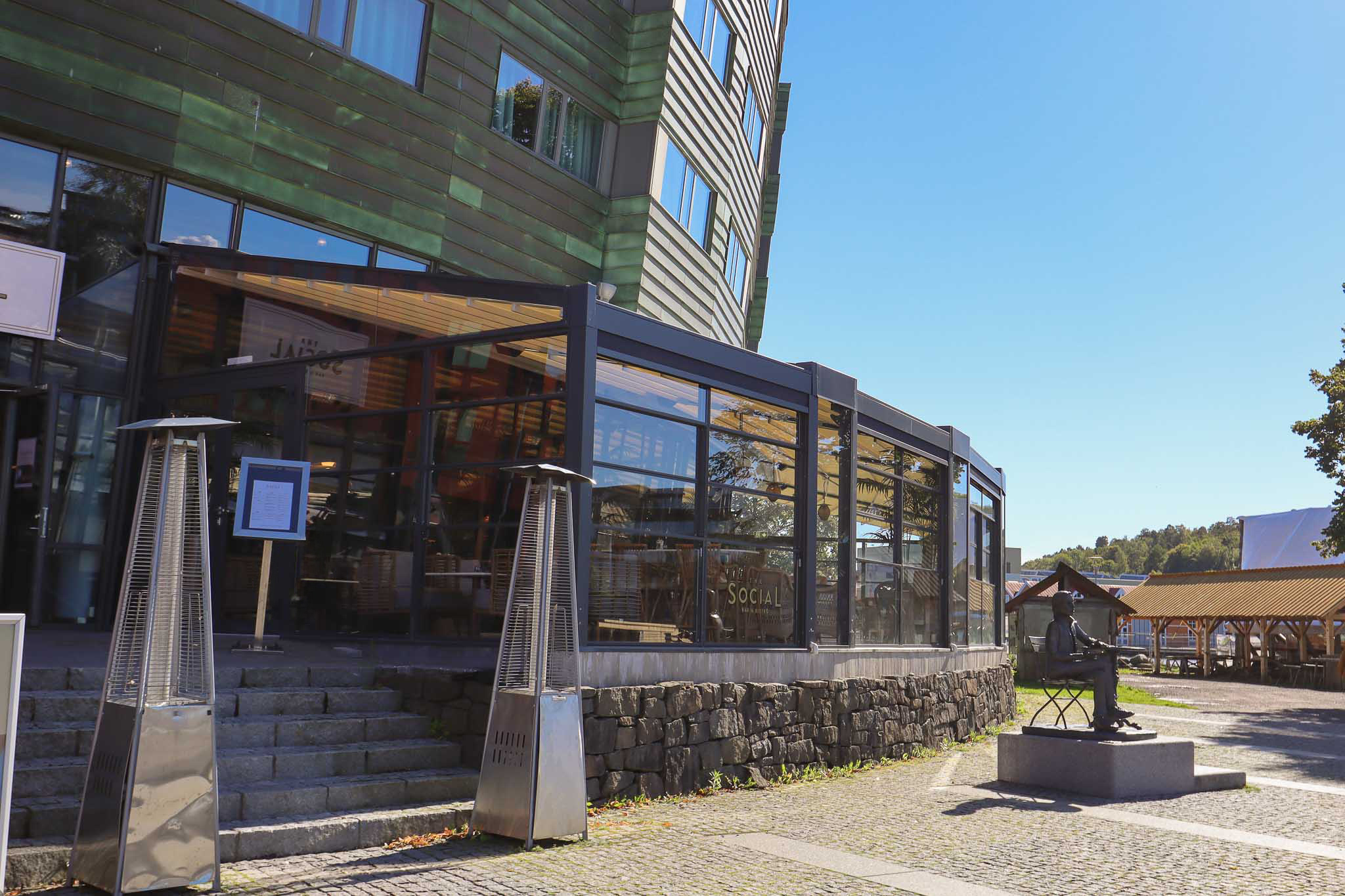 I første etasje på hotellet ligger The Social Bar & Bistro, hvor vi har erstattet den tidligere seilløsningen med seks pergolaer av typen Pratic Meta. Disse pergolaene er utstyrt med splitt glass og zip screen, som gir en elegant og funksjonell løsning for uteserveringen. Gjestene kan nyte måltidene sine i en behagelig skygge, samtidig som de er beskyttet mot vind og vær. Glassveggene i front og på sidene av pergolaene er Svalson splitt hev/senk gjerder, som er manuelt betjent og skjøtene mellom pergolaene og over dør/vegg i sidene er laget av plexiglass. Det er blitt bestilt opp snøtak til uteservering, slik at den også kan brukes på vinterhalvåret. For å sikre at gjestene holder seg varme har vi installert Solamagic S1 varmelamper med kortbølget stråling. Solamagic S1 er den beste varmeløsningen for å oppnå full effekt av varmen, og fungerer godt selv i vindfulle forhold.