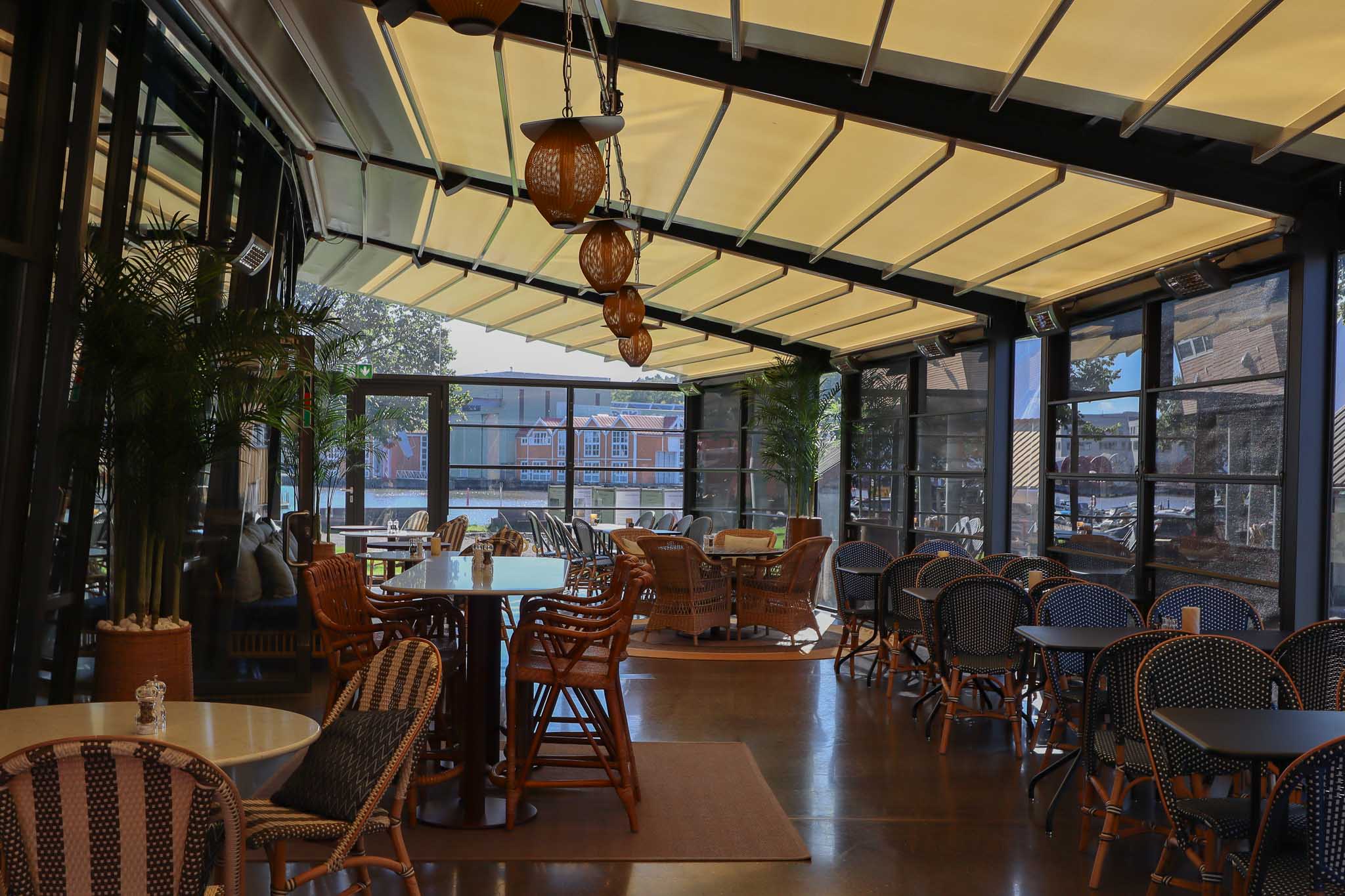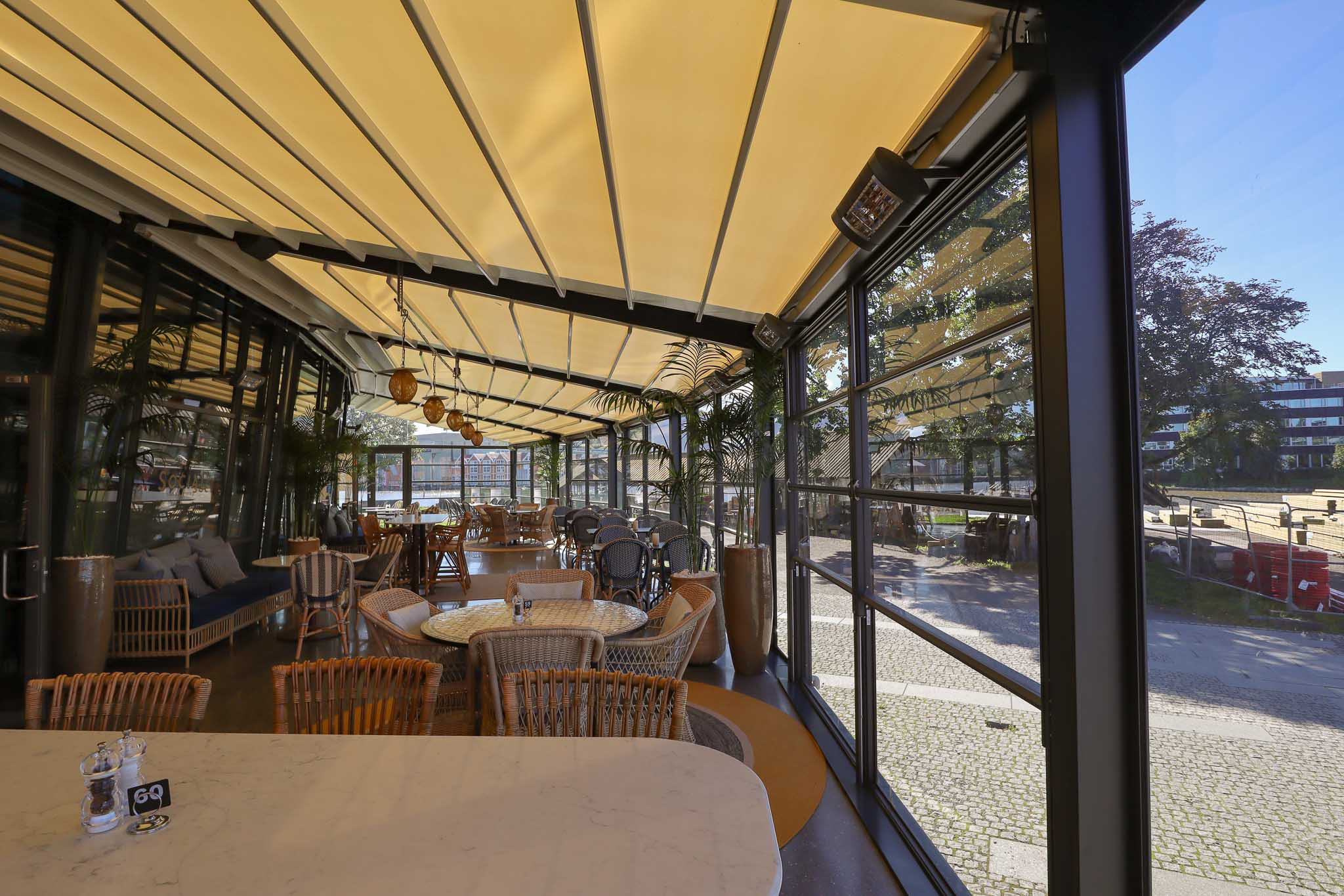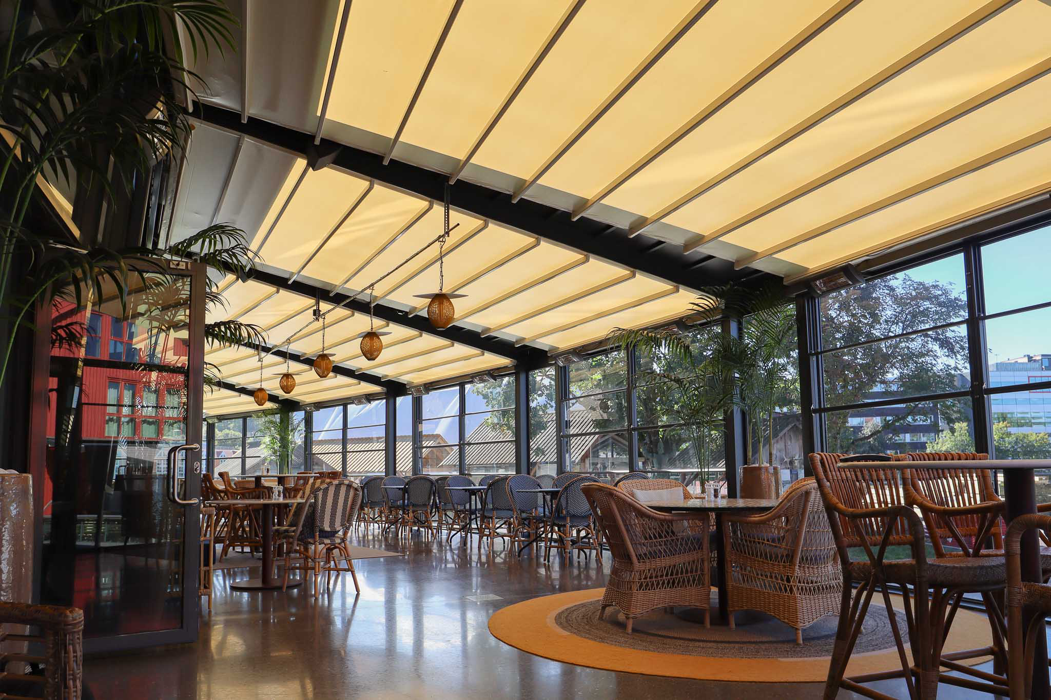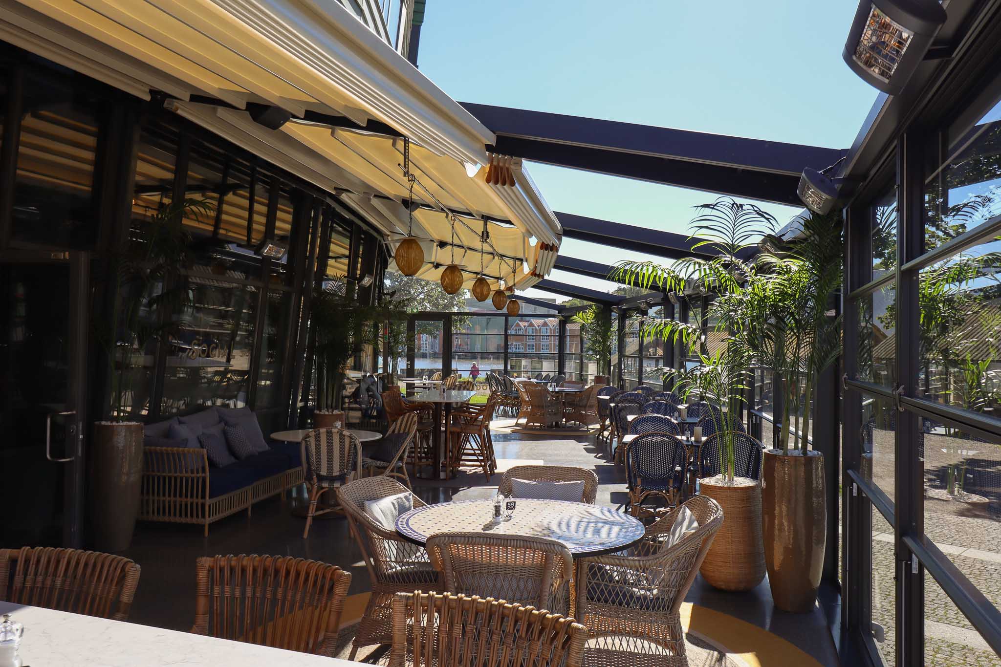 I første etasje på hotellet ligger The Social Bar & Bistro, hvor vi har erstattet den tidligere seilløsningen med seks pergolaer av typen Pratic Meta. Disse pergolaene er utstyrt med splitt glass og zip screen, som gir en elegant og funksjonell løsning for uteserveringen. Gjestene kan nyte måltidene sine i en behagelig skygge, samtidig som de er beskyttet mot vind og vær. Glassveggene i front og på sidene av pergolaene er Svalson splitt hev/senk gjerder, som er manuelt betjent og skjøtene mellom pergolaene og over dør/vegg i sidene er laget av plexiglass. Det er blitt bestilt opp snøtak til uteservering, slik at den også kan brukes på vinterhalvåret. For å sikre at gjestene holder seg varme har vi installert Solamagic S1 varmelamper med kortbølget stråling. Solamagic S1 er den beste varmeløsningen for å oppnå full effekt av varmen, og fungerer godt selv i vindfulle forhold.