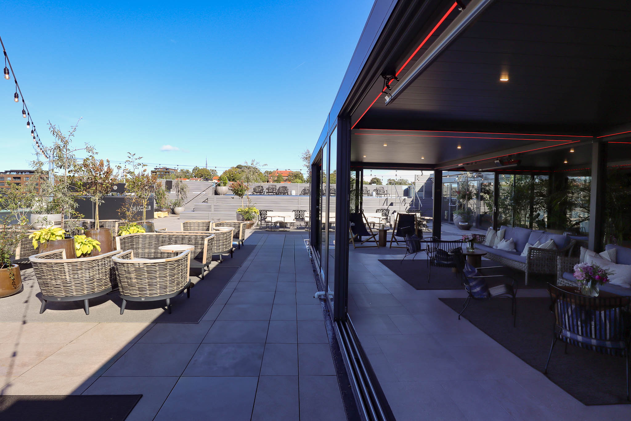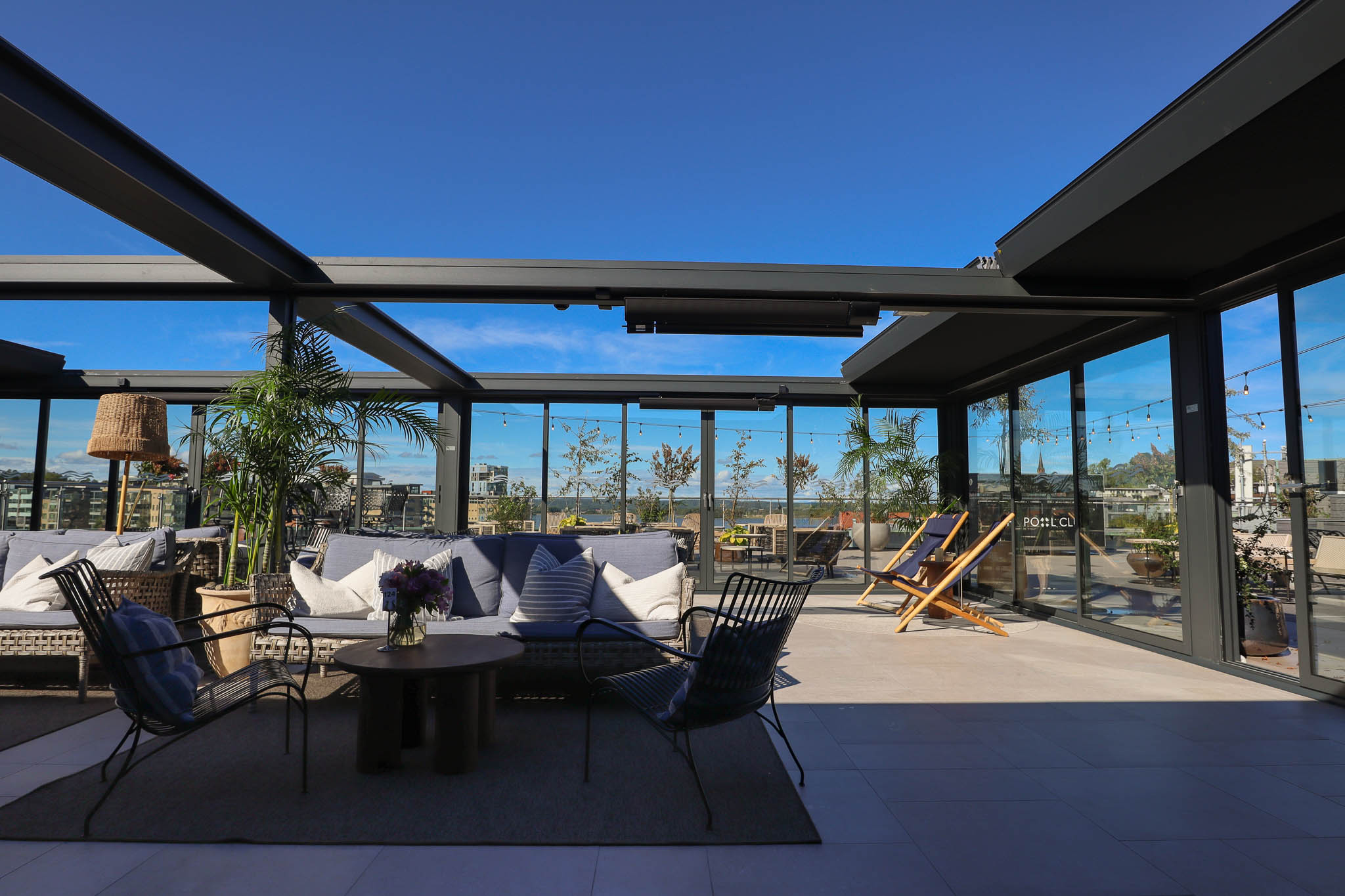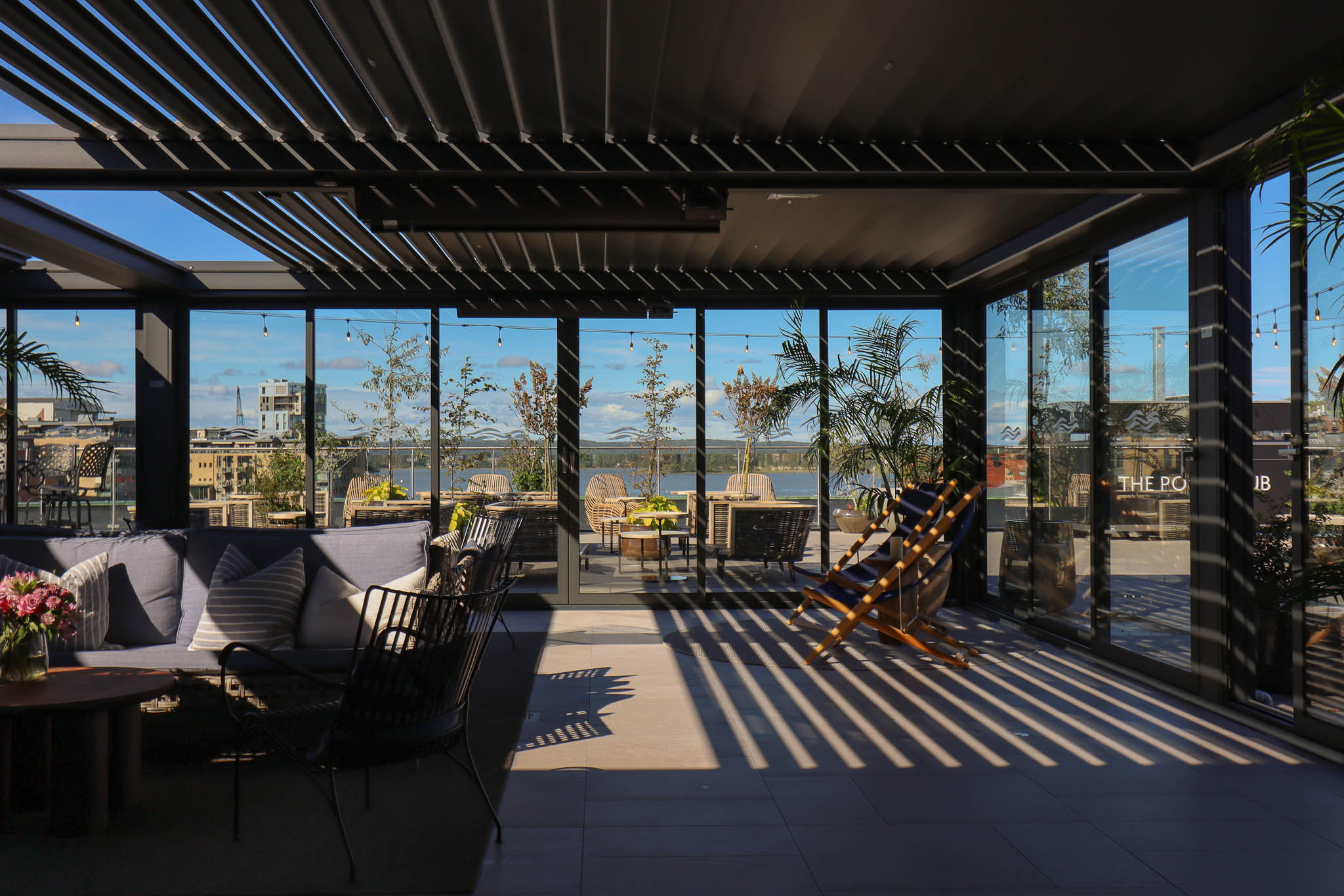 På taket av Quality Hotel Tønsberg finner du The Pool Club, et fantastisk sted hvor gjestene kan nyte en spektakulær utsikt over Tønsberg mens de slapper av i komfortable solsenger eller tar seg en svømmetur i bassenget. Her har vi levert og installert fire Brera pergolaer fra vår italienske leverandør Pratic. Disse pergolaene har et innovativt lamelltak hvor man enten kan åpne delvis opp lamellene ved å snu på dem, eller om man ønsker kan også hele taket trekkes tilbake for å gi total åpenhet. Lamellene kan justeres for å gi optimal beskyttelse mot sol, vind, regn og snø, og skaper en fleksibel løsning som kan tilpasses værforholdene. Pergolaene er lakkert i en av fem standardfarger, og det er LED-lys integrert i rammen rundt på alle fire pergolaene, samt spotter i lamelltaket, noe som skaper en god og lun atmosfære etter solen har gått ned. For å sikre komforten til gjestene, har vi også installert varmelamper av typen NO Glare, som ikke gir noe lys. Disse varmelampene styres av termostat for å oppnå ønsket temperatur, og kan også kontrolleres med fjernkontroller.