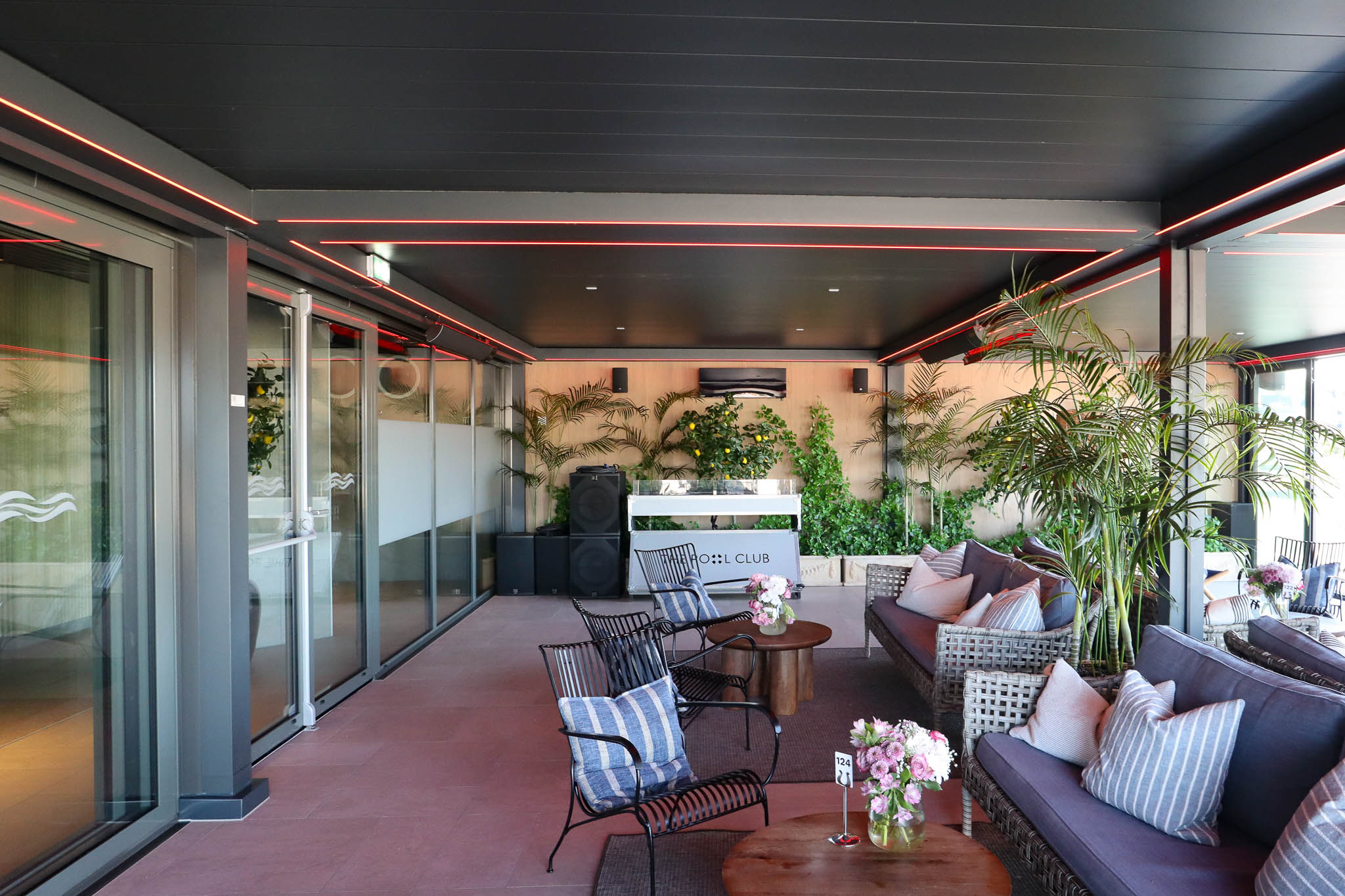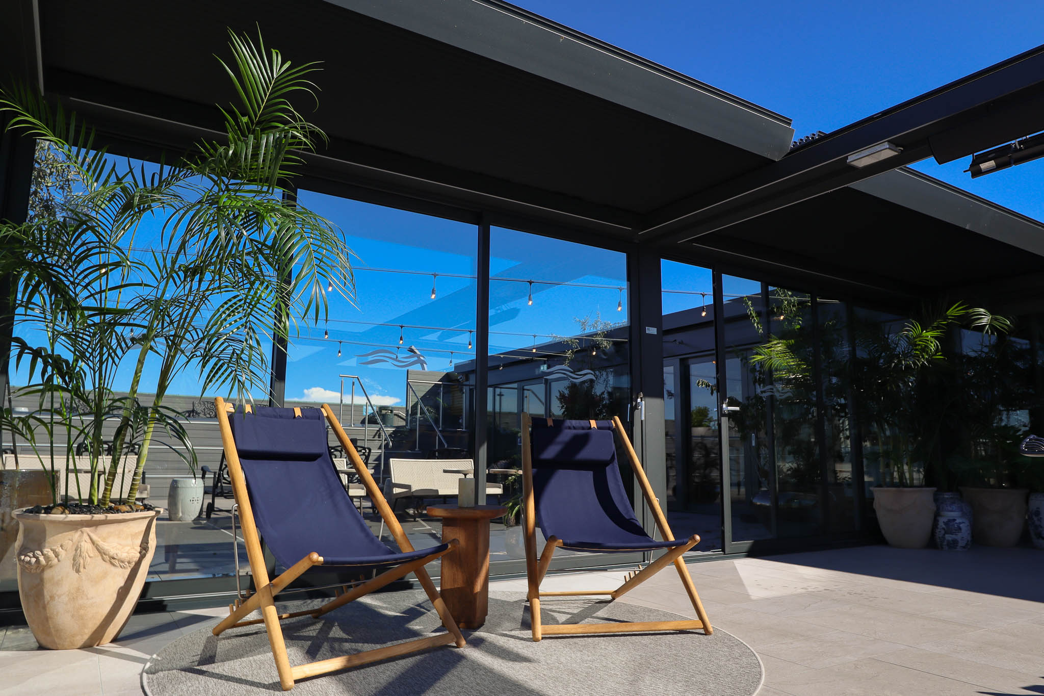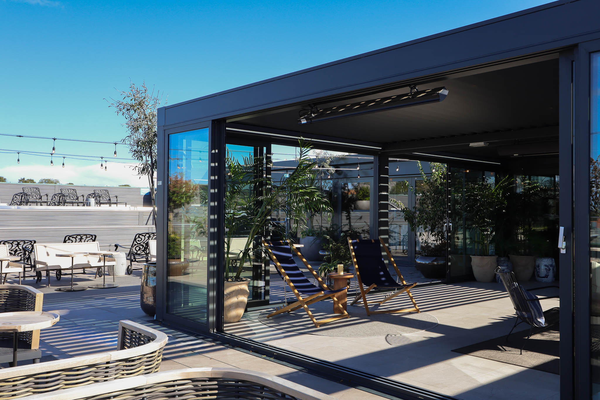 På taket av Quality Hotel Tønsberg finner du The Pool Club, et fantastisk sted hvor gjestene kan nyte en spektakulær utsikt over Tønsberg mens de slapper av i komfortable solsenger eller tar seg en svømmetur i bassenget. Her har vi levert og installert fire Brera pergolaer fra vår italienske leverandør Pratic. Disse pergolaene har et innovativt lamelltak hvor man enten kan åpne delvis opp lamellene ved å snu på dem, eller om man ønsker kan også hele taket trekkes tilbake for å gi total åpenhet. Lamellene kan justeres for å gi optimal beskyttelse mot sol, vind, regn og snø, og skaper en fleksibel løsning som kan tilpasses værforholdene. Pergolaene er lakkert i en av fem standardfarger, og det er LED-lys integrert i rammen rundt på alle fire pergolaene, samt spotter i lamelltaket, noe som skaper en god og lun atmosfære etter solen har gått ned. For å sikre komforten til gjestene, har vi også installert varmelamper av typen NO Glare, som ikke gir noe lys. Disse varmelampene styres av termostat for å oppnå ønsket temperatur, og kan også kontrolleres med fjernkontroller.
