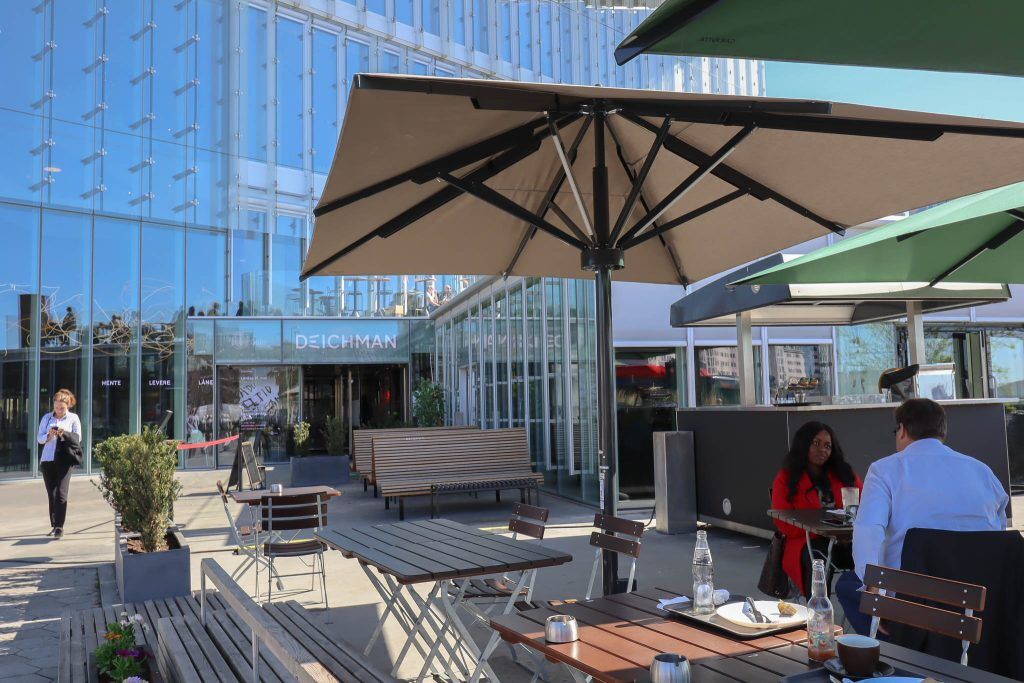 Deichman ligger på et relativt åpent område ned mot Oslofjorden, og er derfor noe vindutsatt. Parasollene til Caravita var derfor et fornuftig valg til denne uteserveringen. Disse er kraftige og tåler og stå oppslått i sterk vind. Parasollene er også valgt med tanke på nærheten til sjøen og eventuelt sjøsprøyt og rust. Masten på parasollene heiser seg noe opp når den lukkes, slik at den ikke blir i veien for kundene, og stoler og bord kan bli stående. Parasollene har også integrert dimbart LED-lys som skaper en lun og god stemning også etter sola har gått ned.