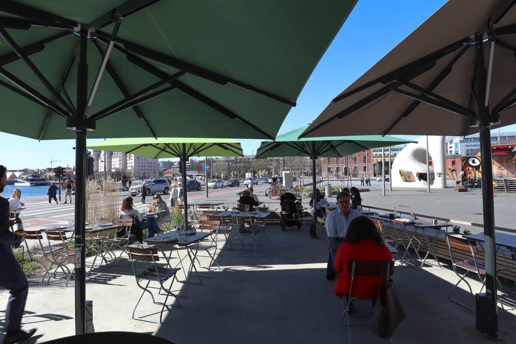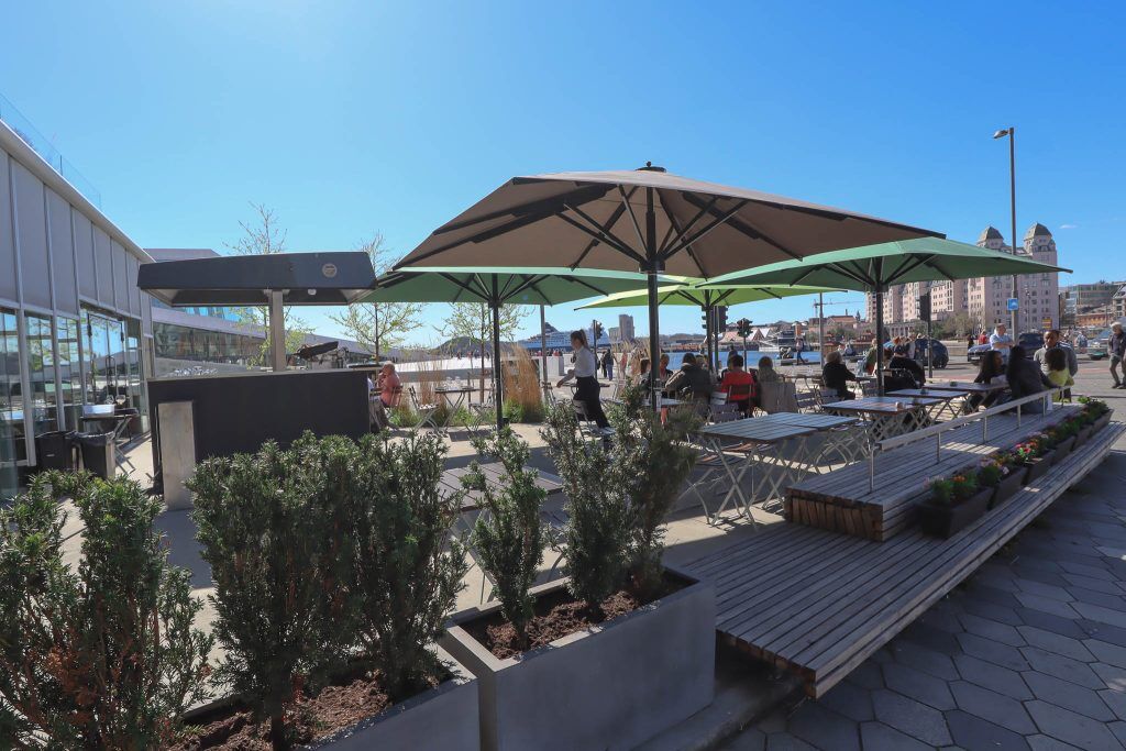 I de nye lokalene til Deichman Bjørvika, Oslos hovedbibliotek, finner man restauranten og kaféen Centropa. Spisestedet ble fort et populært samlingspunkt etter at de åpnet i 2020, og det oppstod derfor ett behov for å utvide med uteservering i første etasje. Vi i Solskjermingsgruppen AS leverte til sammen fire parasoller produsert av Caravita i en noe unik fargekombinasjon til deres uteområde.
