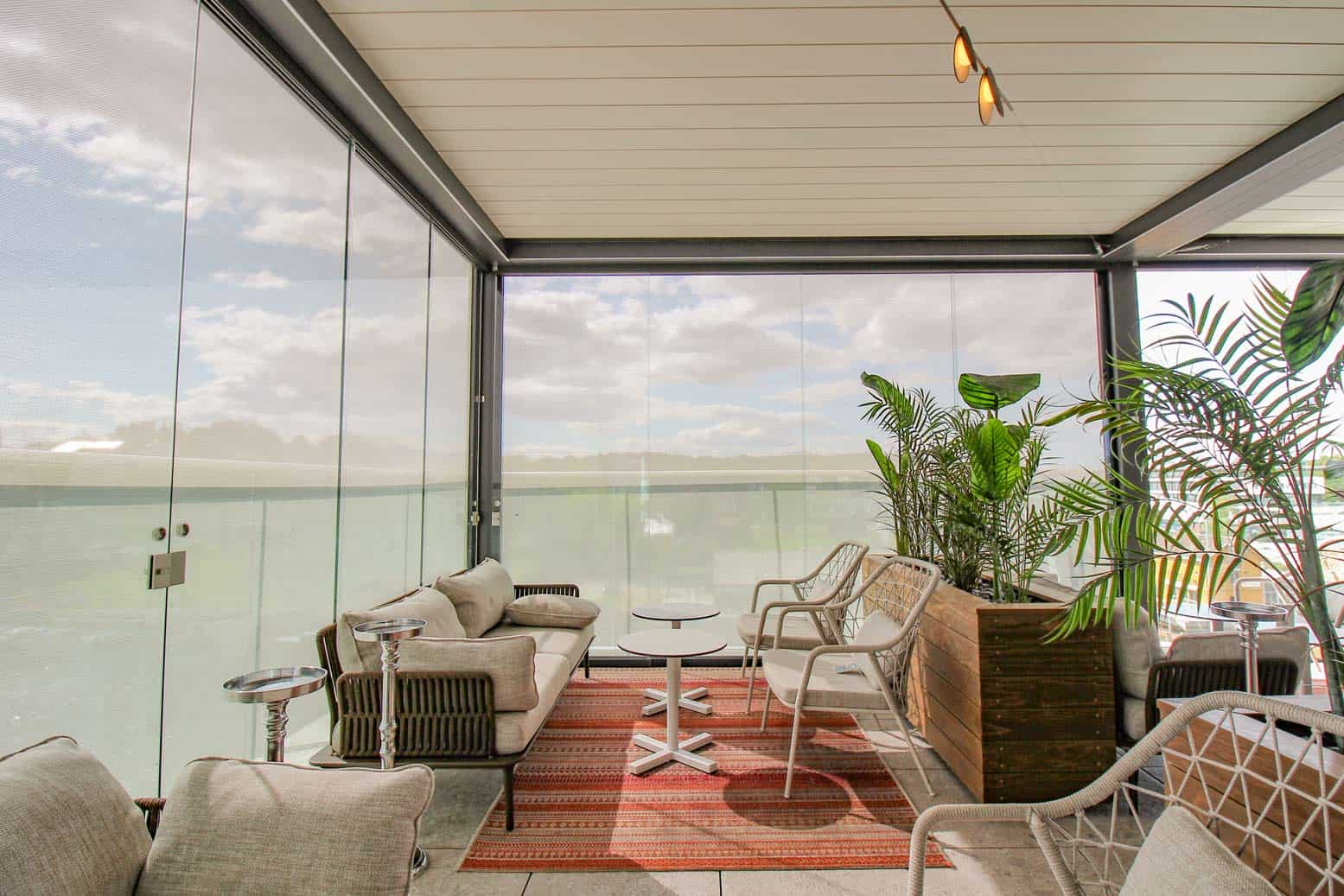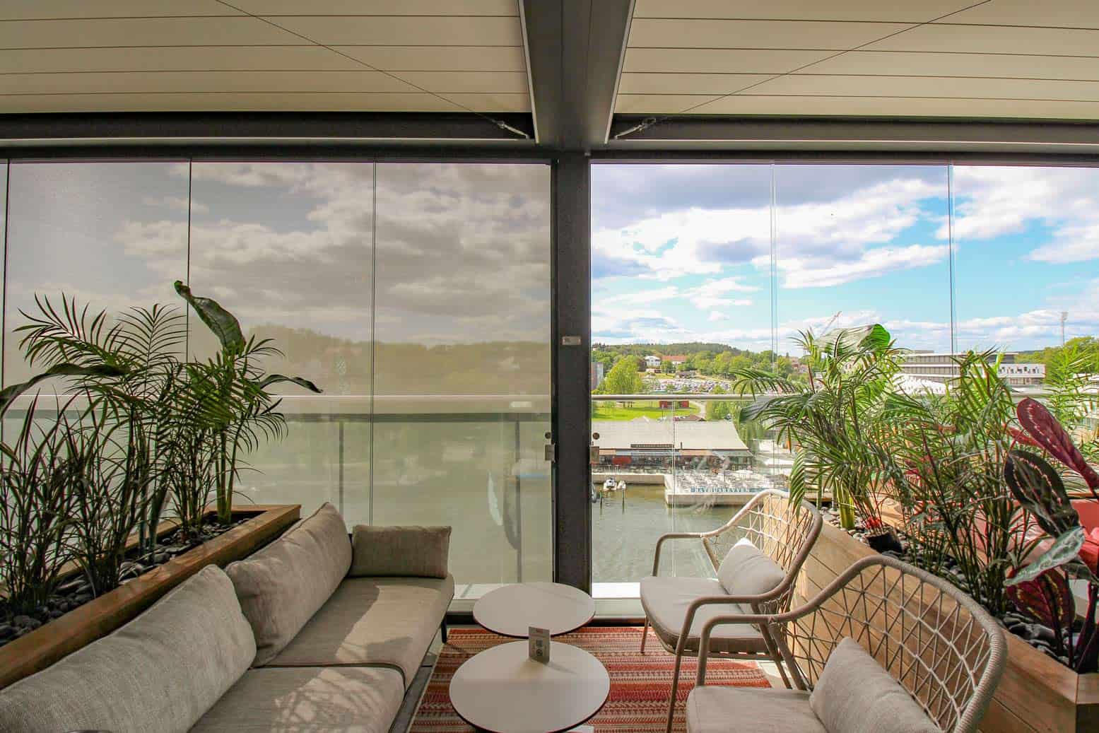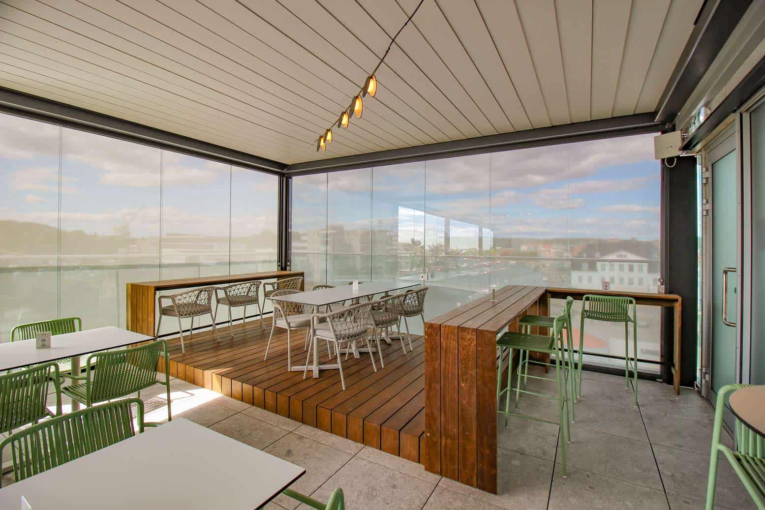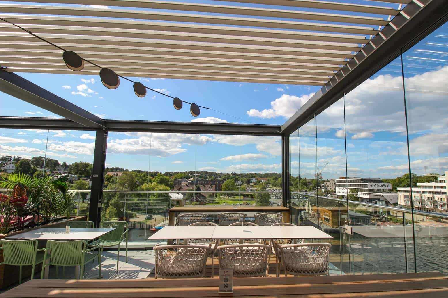 Selve uteserveringen er innglasset med skyveglass fra Pratic. Skyveglasset skjermer godt for vinden, samtidig som at den fantastiske utsikten fra uteserveringen opprettholdes. Skyveglasset i seg selv skjermer nok for vind, men glasset vil ikke skjerme for sterk sol. Vi valgte derfor å kombinere en skjermløsning bestående av skyveglasset og raso levegger.