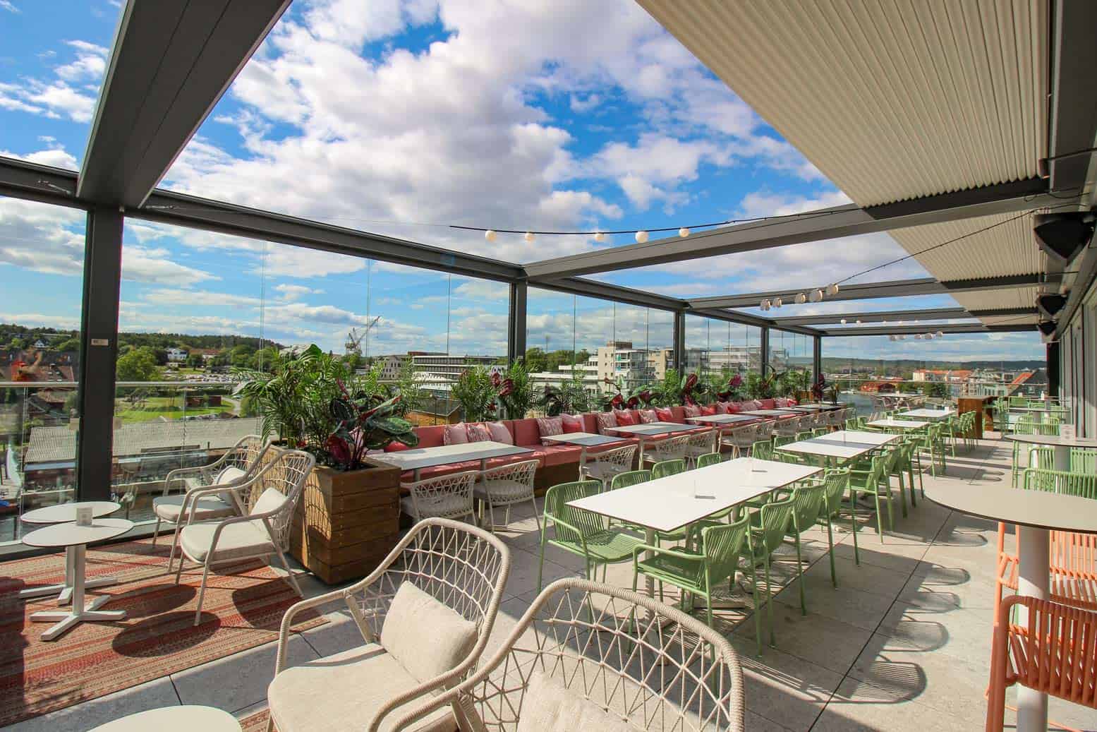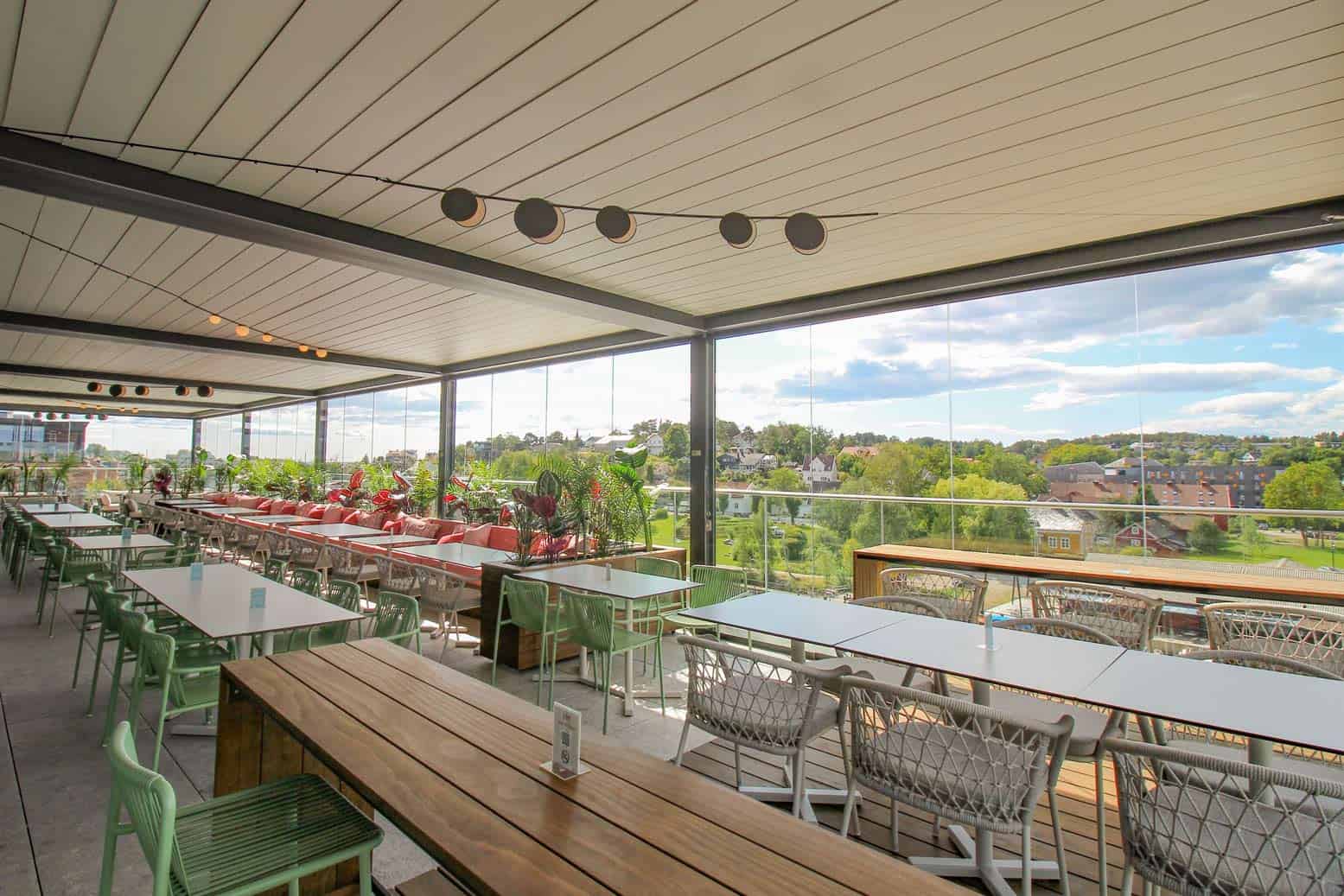 Løsningen ble da en uteservering bestående av et komplett pergolasystem med italienske pergolaer i modellen Brera, skyveglass, raso levegger og varmelamper. Uteserveringen består av fem pergolaer som er montert sammen til ett system. Pergolaene skjermer hele 22 meter i lengden og nesten 6 meter i bredden. Skjermingen av dette store arealet har økt kapasiteten på terrassen betraktelig fra tidligere år, slik at nå kan enda flere gjester kose seg på uteserveringen året rundt.