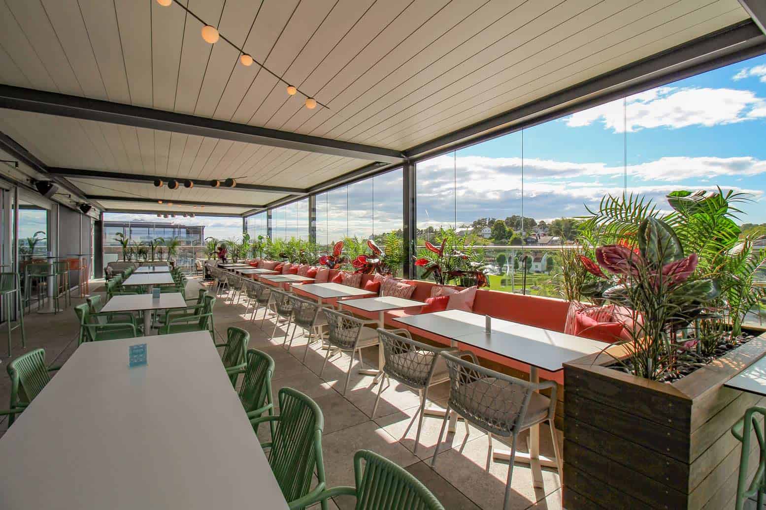 Raso leveggene skjermer for solen og kan styres individuelt fra hverandre. Selv om leveggene fungerer som solskjerming, er det laget av en spesiell perforert duk som gjør det mulig å ha godt utsyn, selv når solskjermingen er nede. Det var viktig å sørge for at uteserveringen var skjermet mot sol, da det fort kan bli veldig varmt på sommerhalvåret uten skjerming.